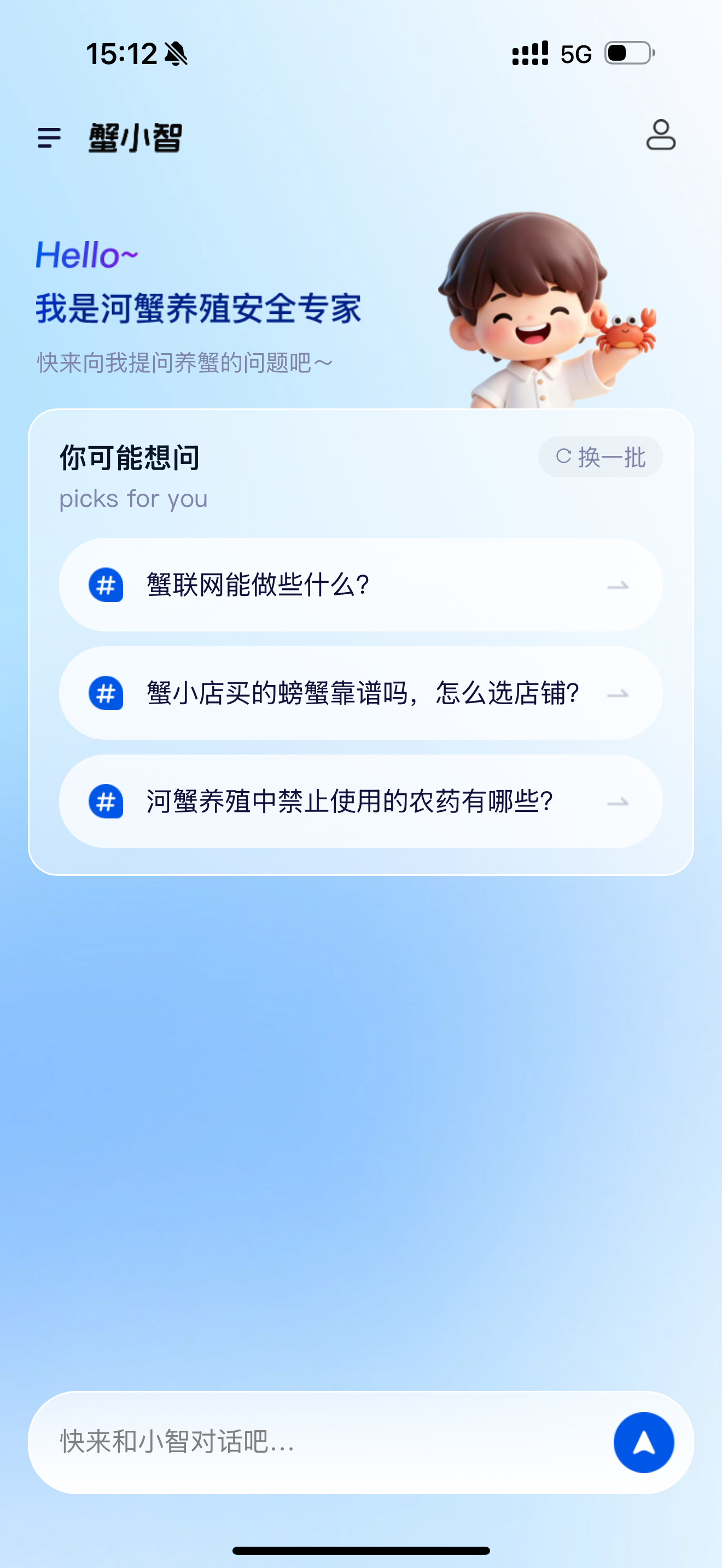 蟹小智是一款 AI 聊天应用, 专门为河蟹养殖行业打造, 帮助养殖户快速解决养殖问题。